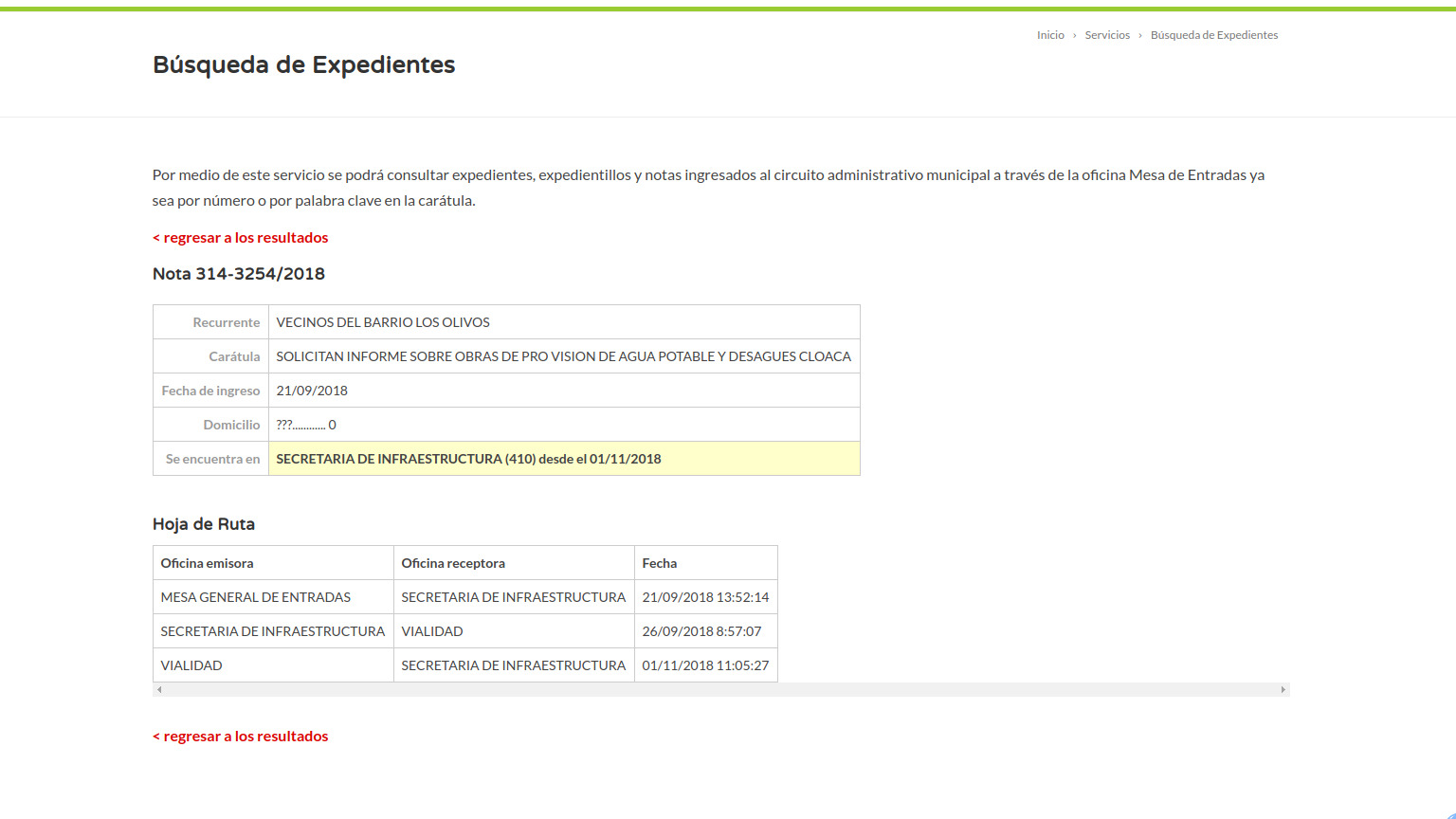 Estimado , con respecto a su consulta en el siguiente link: https://www.bahia.gob.ar/servicios/expedientes/ ingresa en la búsqueda por nro 3254 y año 2018 y le mostrara el paso a paso de su expediente . Para saber su estado actual puede comunicarse con la Secretaria de Infraestructura al +54 (291) 456-3965 Int. 2992-2145 . Le envío de todas maneras una captura de pantalla para que pueda visualizar el paso a paso. Saludos Cordiales !