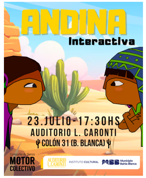 ANDINA Interactiva, un vibrante espectáculo de danza teatro para todas las edades, donde el público será transportado a la mágica región del noroeste argentino. Con personajes encantadores y un escenario lleno de color, esta historia nos invita a conocer y reflexionar sobre las hermosas costumbres de esta cultura. A través del poder de la danza y el teatro, recordaremos la importancia de la amistad, la fuerza de la familia, el valor del trabajo en comunidad y la necesidad imperante de cuidar de nuestra querida PACHAMAMA.