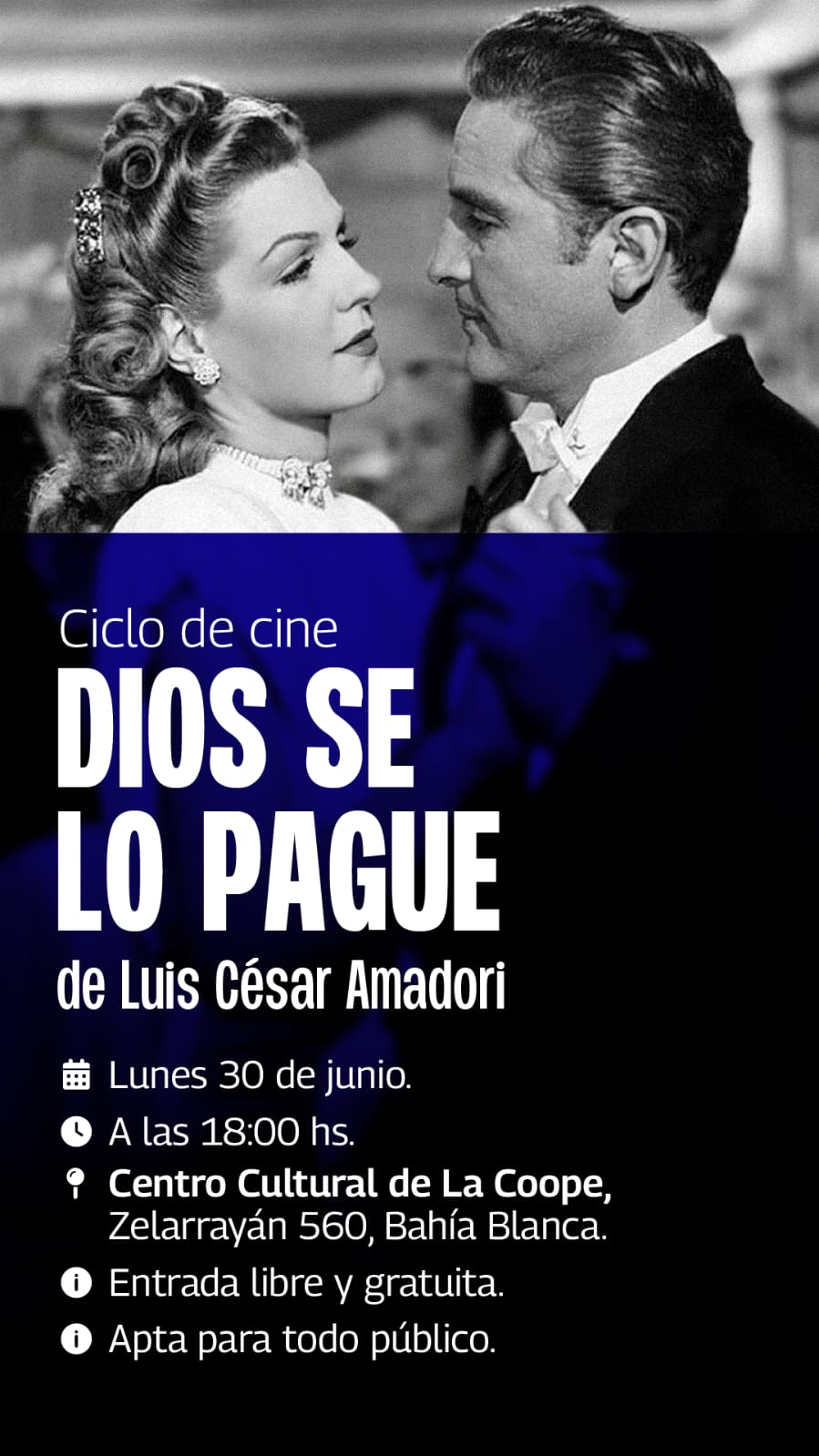 Una nueva edición del ciclo “Historia y Tango en el cine” tendrá lugar el próximo lunes 30 de junio , a las 18hs, en el Centro Cultural de la Cooperativa Obrera (Zelarrayán al 500), con la proyección de “Dios se lo pague” , una película dirigida por Luis César Amadori y protagonizada por Zully Moreno y Arturo de Córdova, adaptación de la obra teatral homónima del periodista y dramaturgo brasileño Joracy Camargo.