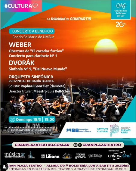La Orquesta Sinfónica Provincial estará bajo la dirección del maestro titular Luis Belforte y participará el solista en clarinete Raphael González. En el programa se interpretará la Obertura “El cazador furtivo” y el Concierto para clarinete N° 1 en fa menor, Op.73 de Carl Maria von Weber y culminará con la imponente “Sinfonía Del Nuevo Mundo” de Antonín Leopold Dvořák. Parte de lo recaudado será destinado al Fondo Solidario de UMSur para asistir músicos y música afectados por la inundación.