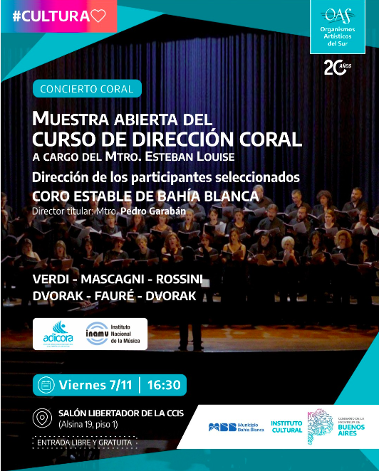 🎶 El Coro Estable de Bahía Blanca interpretará fragmentos de grandes obras bajo la dirección de los participantes del Curso dictado por el Mtro. Esteban Louise (Uruguay).