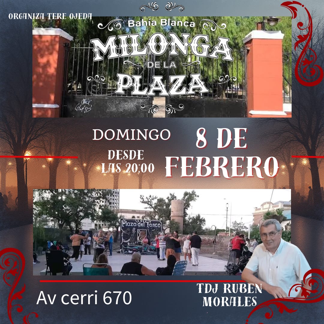 🎉 MILONGA DE LA PLAZA te invita 🗓️8 de Febrero, ⏰desde las 20:00 hs en 💿 Tdj Ruben Morales🎧 📍Av. Cerri 670, Bahía Blanca.