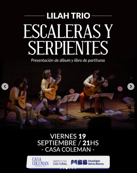 Lilah trío se presenta nuevamente para reestrenar este concierto: “Escaleras y Serpientes”, que da nombre al disco del trío y también al libro de partituras. Se interpretarán las 11 obras originales para trio de guitarras.