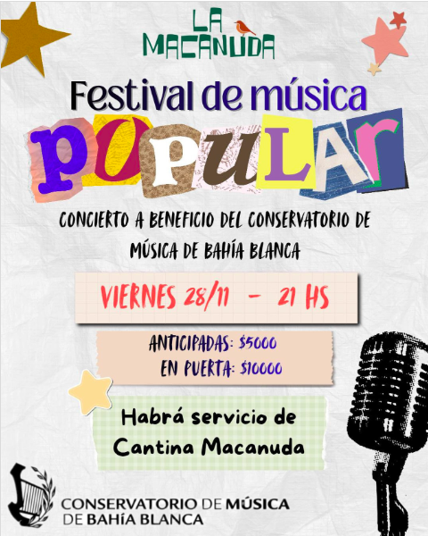 Este viernes 28 de noviembre, a las 21 horas, hay un concierto a beneficio del Conservatorio de Música de Bahía Blanca, con la participación de estudiantes de Formación Básica y Carreras de Canto Popular.