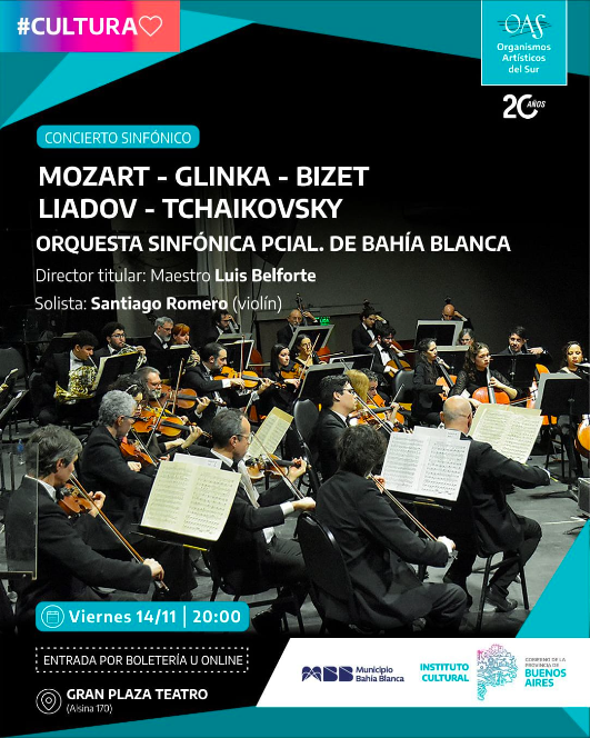 Bajo la dirección del maestro titular Luis Belforte y la participación del solista invitado Santiago Romero (violín), se interpretará el siguiente programa: “Concierto para Violín N° 5 en La mayor, K. 219” de Wolfgang Amadeus Mozart, la “Obertura de Ruslan y Ludmila” de Mijaíl Glinka, la “Suite N° 1 de Carmen” de Georges Bizet, “El Lago Encantado, op. 62”(poema sinfónico) de Anatoli Liadov y “Polonesa de Eugene Onegin” de Piotr Ilich Tchaikovsky.