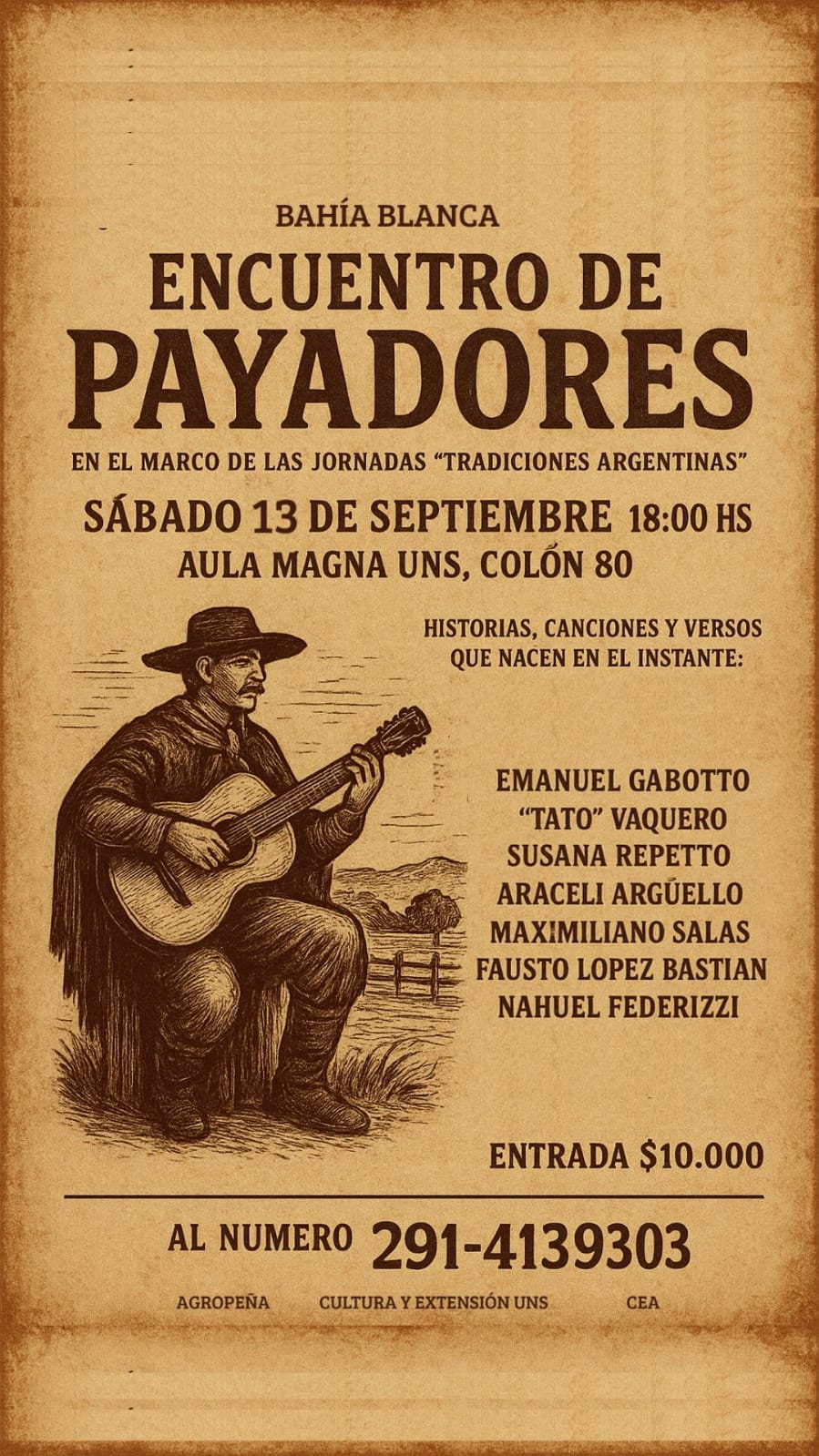 Sábado 13 de septiembre, 18:00 hs. Aula Magna, Av. Colón 80, ENCUENTRO DE PAYADORES