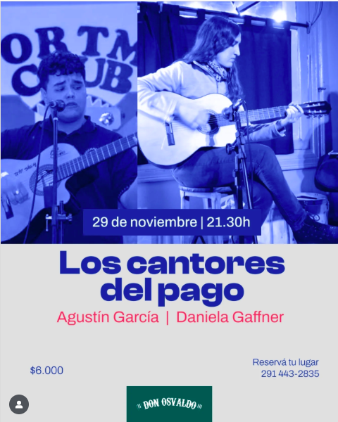 Este sábado, la guitarra y la voz nos llevan de viaje a “el Pago”. Recibimos a Agustín García y Daniela Gaffner (Los Cantores del Pago), dos voces y dos guitarras para una noche de puro folclore popular.
