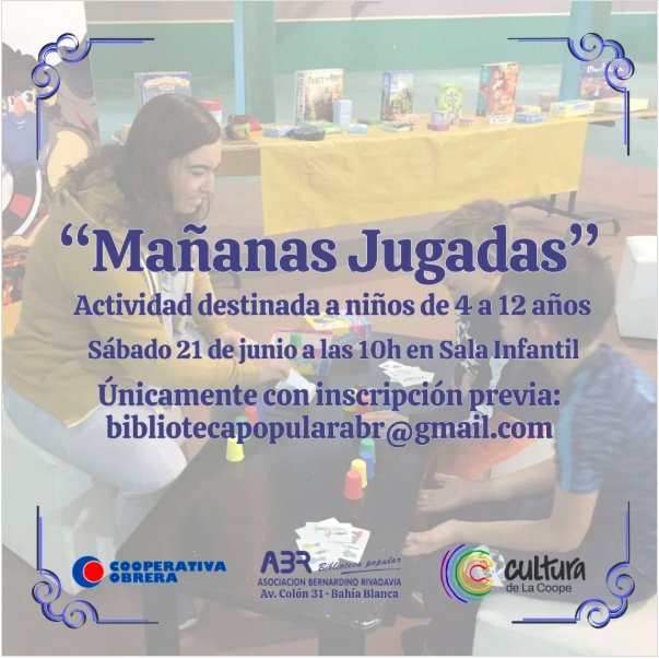 “Mañanas Jugadas” Actividad destinada a niños de 4 a 12 años. Únicamente con inscripción previa: bibliotecapopularabr@gmail.com Sábado 21 de junio a las 10h en Sala Infantil