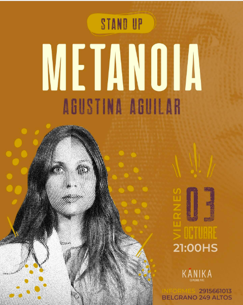 👉 Metanoia es un show de stand up que expone fracasos, vergüenzas y anécdotas con una mirada irónica sobre las vivencias de una persona que intenta encajar en un mundo incómodo y cambiante. Desde la educación Polimodal hasta la maternidad moderna, Agustina recorre su experiencia dándole protagonismo al humor por sobre todo.