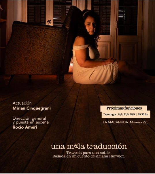 Este domingo 14 de deptiembre nueva fecha de “Una mala traducción”, una travesía para una actriz basada en un cuento de Ariana Harwicz ✨