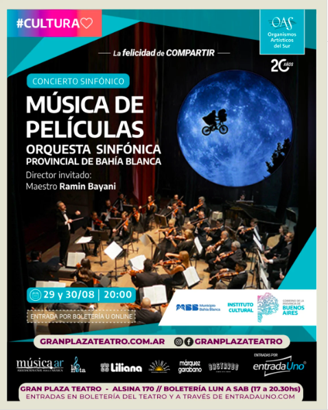 La Orquesta Sinfónica Provincial ofrecerá dos conciertos sinfónicos los días viernes 29 y sábado 30 de agosto a las 20:00 en el Gran Plaza Teatro. La función estará bajo la dirección del maestro invitado Ramín Bayani y participarán como solistas Oleg Shkolyar, (trompeta), Mario Joel Mujica (violín) y Nicolás Malbos (bandoneón). Esta actividad forma parte de la agenda del Instituto Cultural de la Provincia de Buenos Aires.
