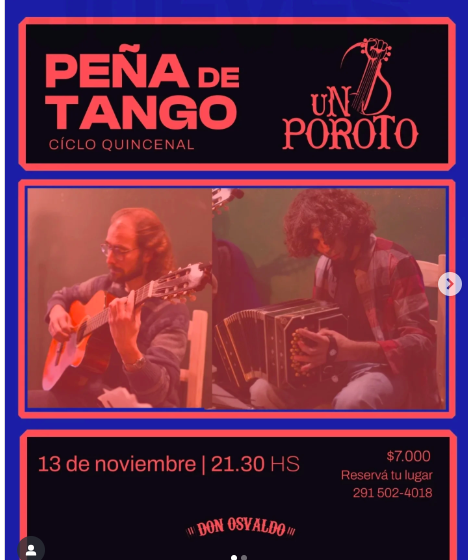 Amigos, los muchachos que nos volaron la cabeza el sábado en “la Inevitable” vuelven a la mesa del Don Osvaldo. Este jueves, la Peña de Tango “Un Poroto” nos trae la esencia pura: Nicolás Pereyra en bandoneón y Nicolás Fernández Vicente en guitarra.