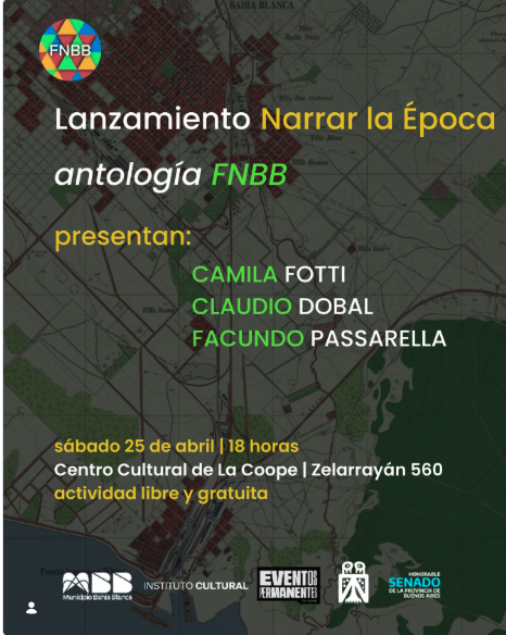 Estamos muy felices de anunciar que este sábado 25/04 -a partir de las 18:00, en el Centro Cultural de La Coope- presentaremos Narrar la época, una antología que recopila los textos presentados y trabajados en nuestra clínica de obra “Escribir la época”, de 2024.