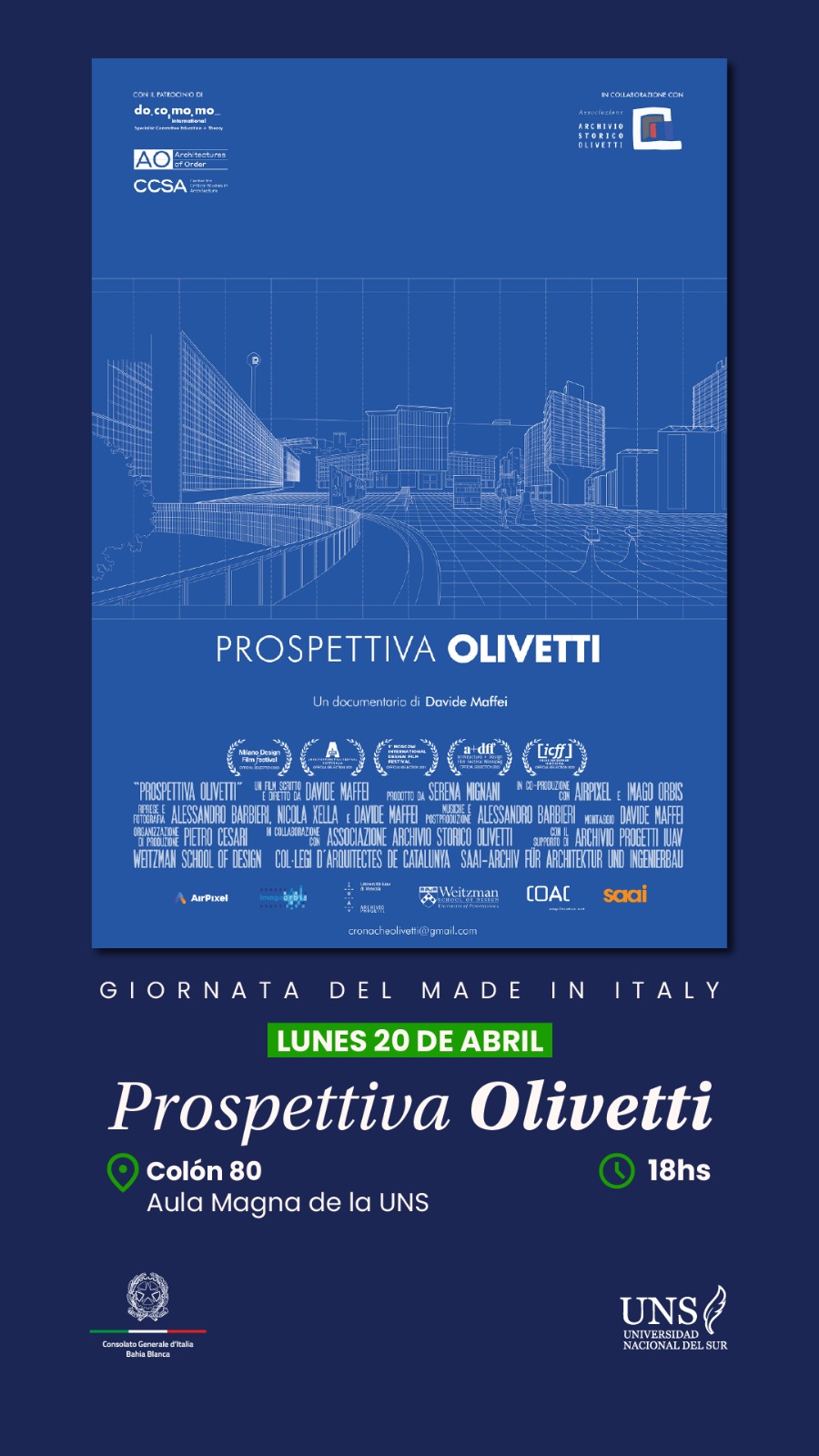 El Consulado General de Italia en Bahía Blanca junto con la Universidad Nacional del Sur anuncia la proyección de los documentales “Paradigma Olivetti” y “Prospettiva Olivetti” en el marco de la jornada del Made in Italy, en el mes de abril.