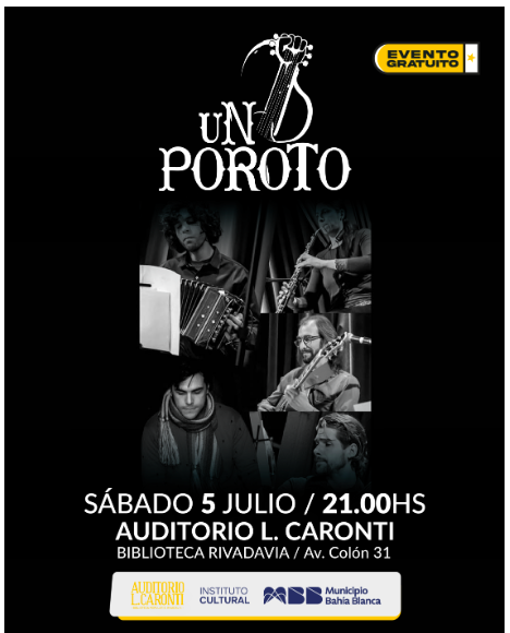 “Un poroto” es un grupo de músicxs que comenzó a vincularse a través de la peña de tango que tiene lugar jueves de por medio en el Café Cultural Don Osvaldo del Centro Cultural La Panadería, en la ciudad de Bahía Blanca. Desde el 31 de marzo de 2022, el espacio fue construido y sostenido por músicas, músicos y cantantes de distintas generaciones de la ciudad y la región que están en vinculación con el género tango, tanto de forma profesional como no profesional. Simultáneamente con sus participaciones en la peña, algunxs de ellxs comenzaron un proyecto de ensamble con la idea de promover un repertorio original dentro del género, partiendo del sobreentendido de que, si el tango es música porteña argentina, somos porteños por definición: Bahía Blanca es una ciudad portuaria que, como el tango, se consolidó con el Estado argentino. Hace falta una música porteña que recupere esa tradición para transformarla y que surja de la experiencia de vivir hoy en esta ciudad.