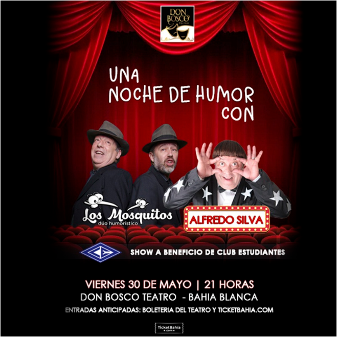 Los Mosquitos se presentan en el Teatro Don Bosco a total beneficio del Club Estudiantes para la reconstrucción de la Cancha N° 2. Con la participación de Alfredo Silva, el humorista de la Tv.