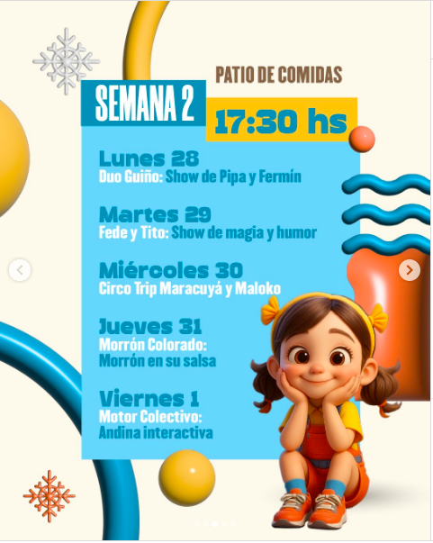 👉 Mirá el cronograma de shows infantiles que pensamos para que vengas a disfrutar en familia: habrá música, circo, humor, magia y, sobre todo, ¡mucha diversión!