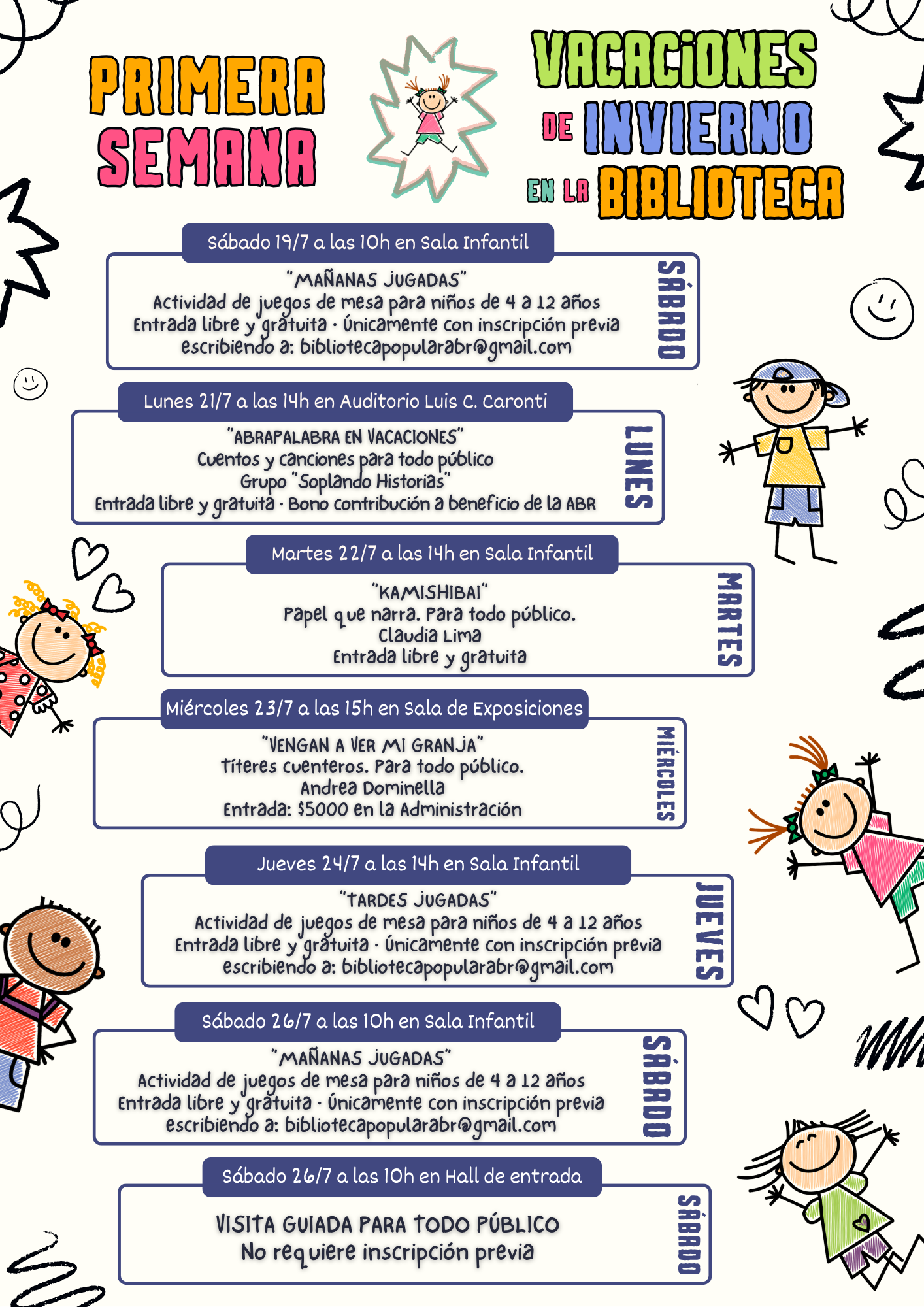 – Sábado 26 de julio a las 10h en Sala Infantil: “Mañanas jugadas” Actividad con cupo limitado, destinada a niños de 4 a 12 años. Únicamente con inscripción previa: bibliotecapopularabr@gmail.com